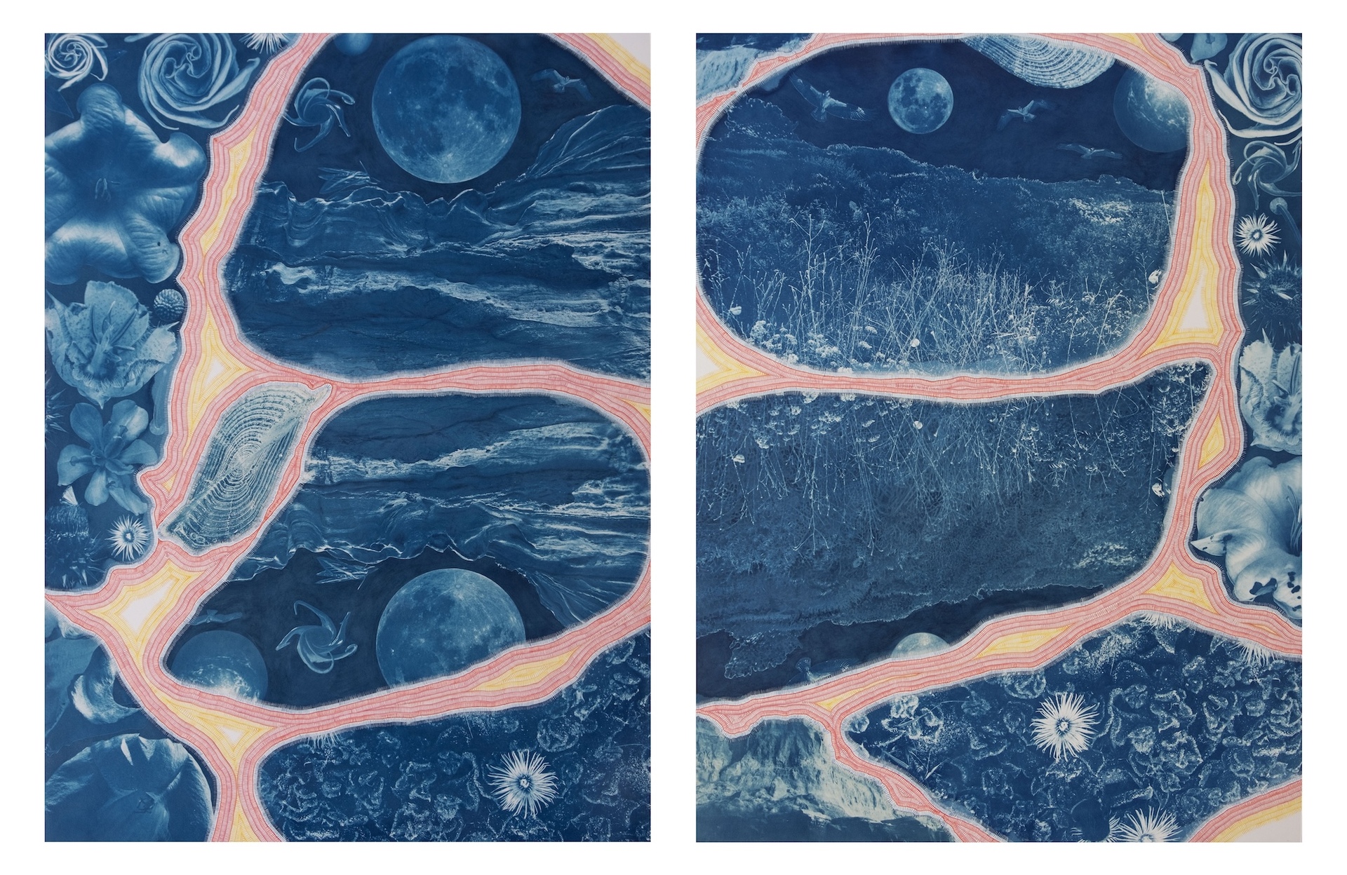 Annalise Neil, Lineage Echoes, 2024. Cyanotype and watercolor on Hahnemuhle platinum rag paper, 24" x 36".