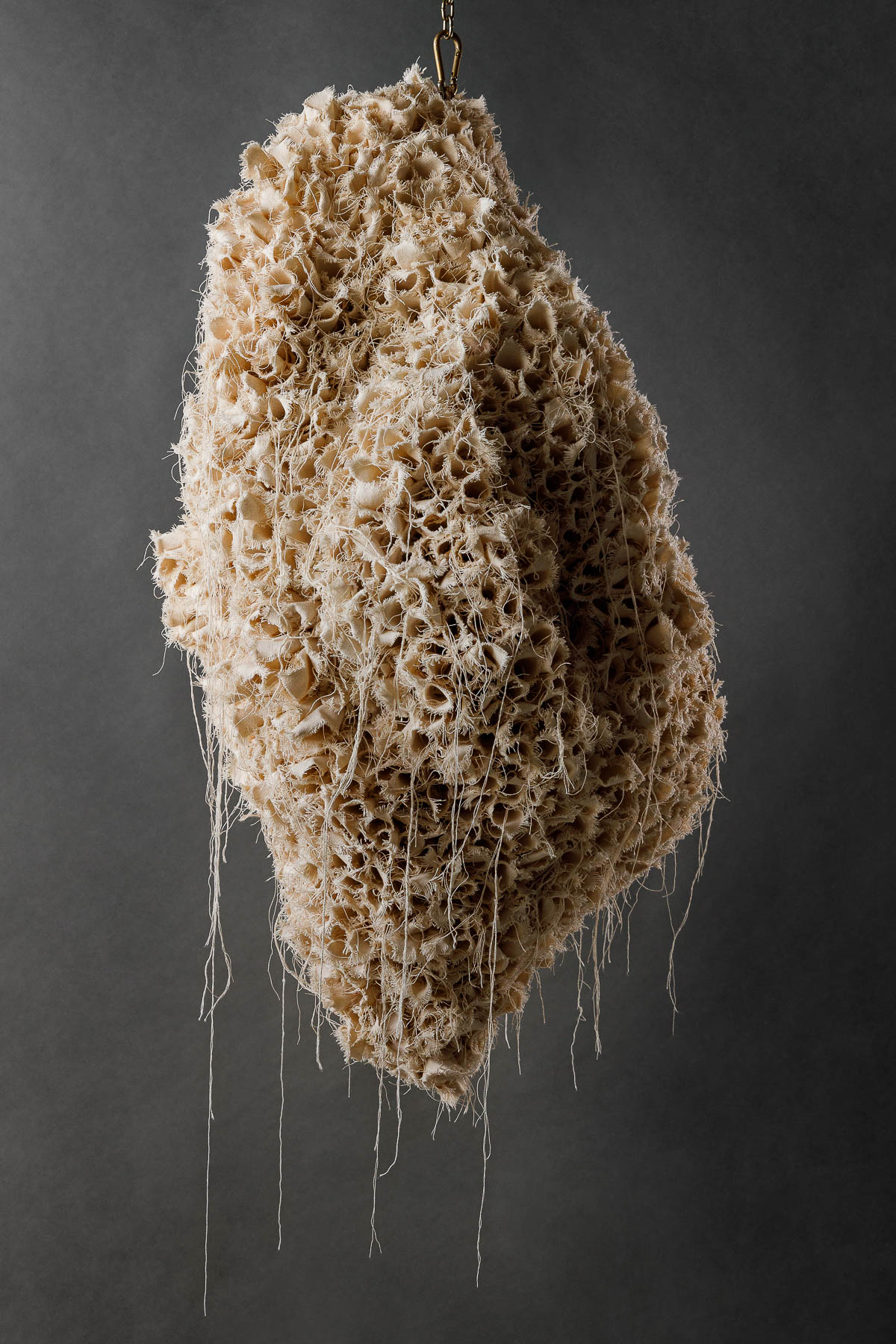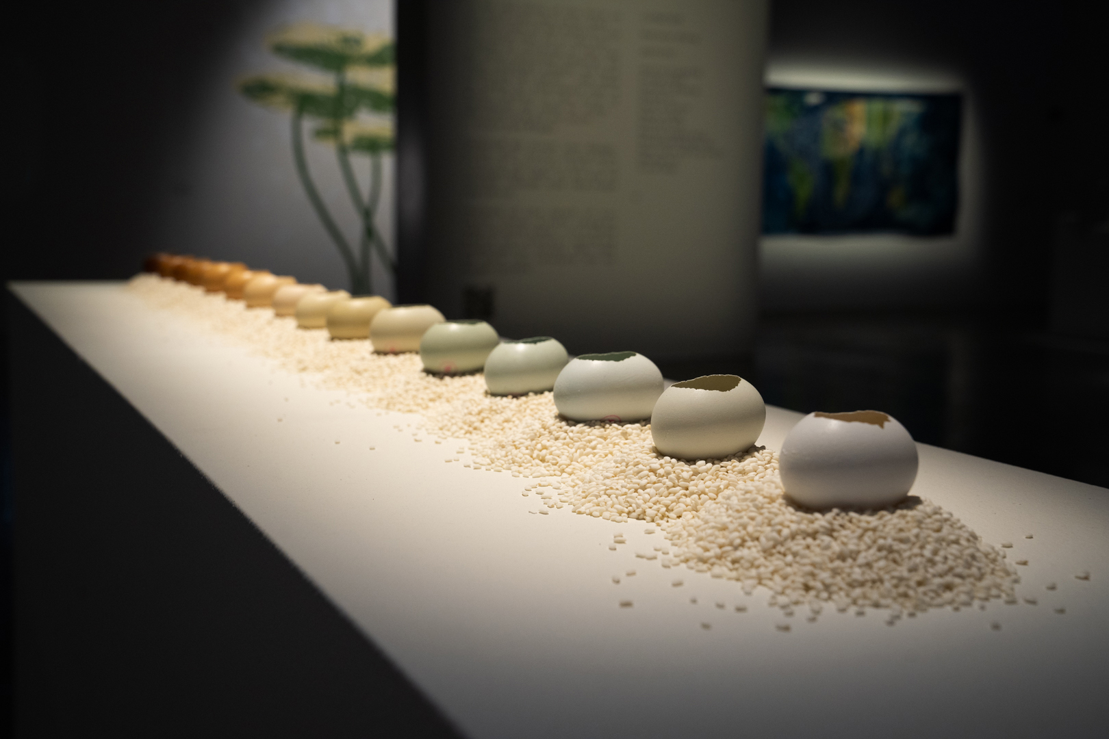 Trinh Mai, Seed, 2022. Acrylic, ink, charcoal, and resin encapsulated in eggs on rice, 4" x 95" x 8".