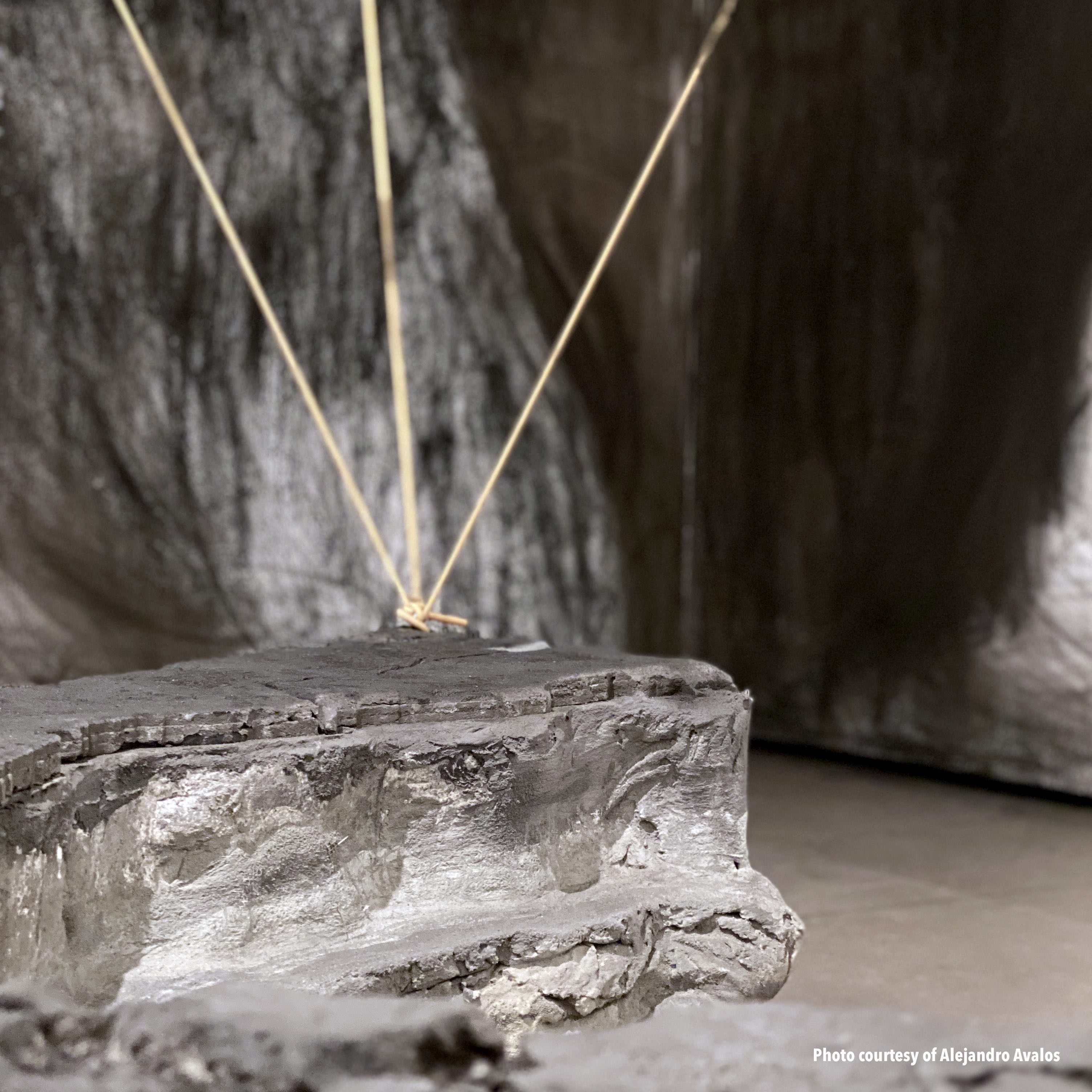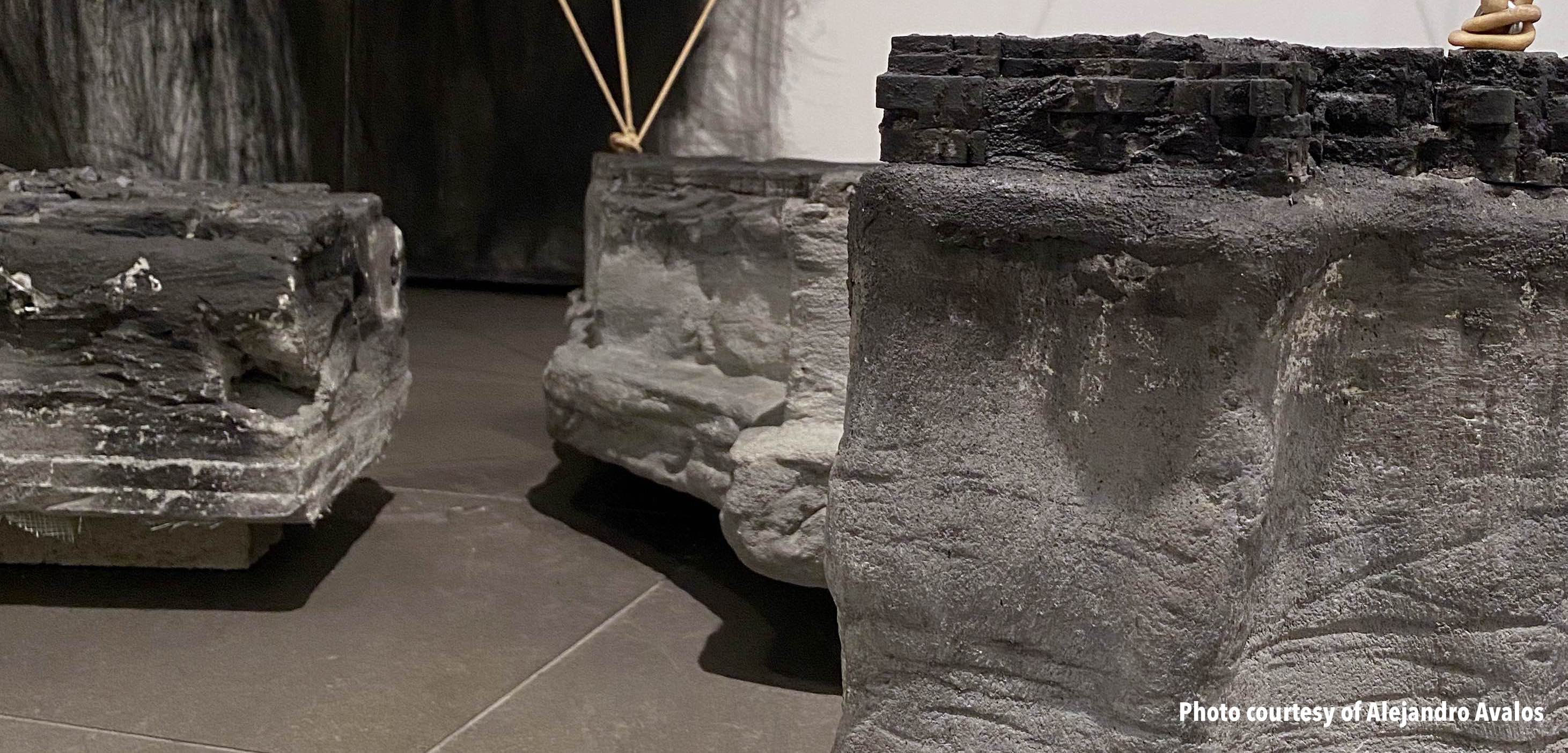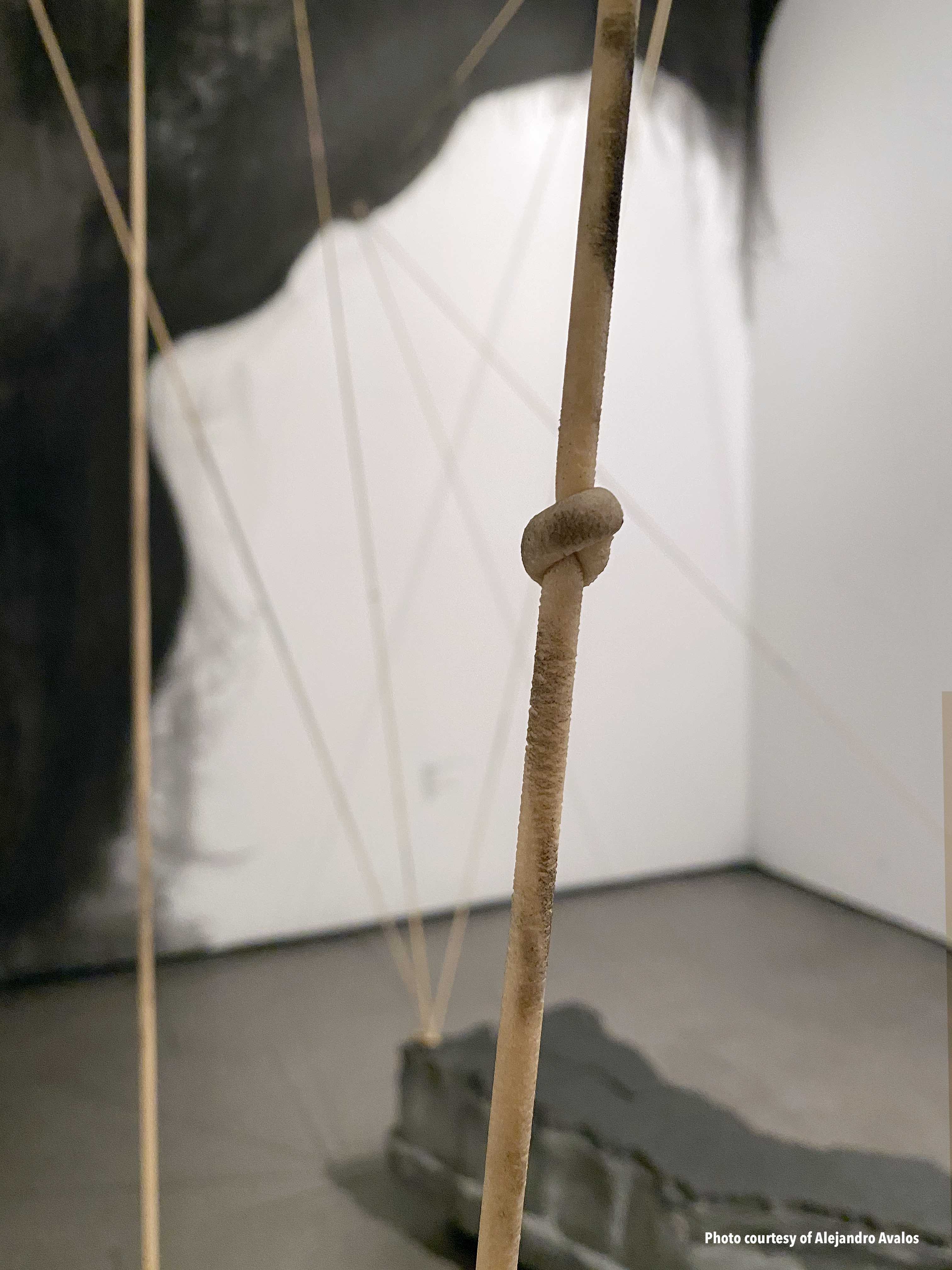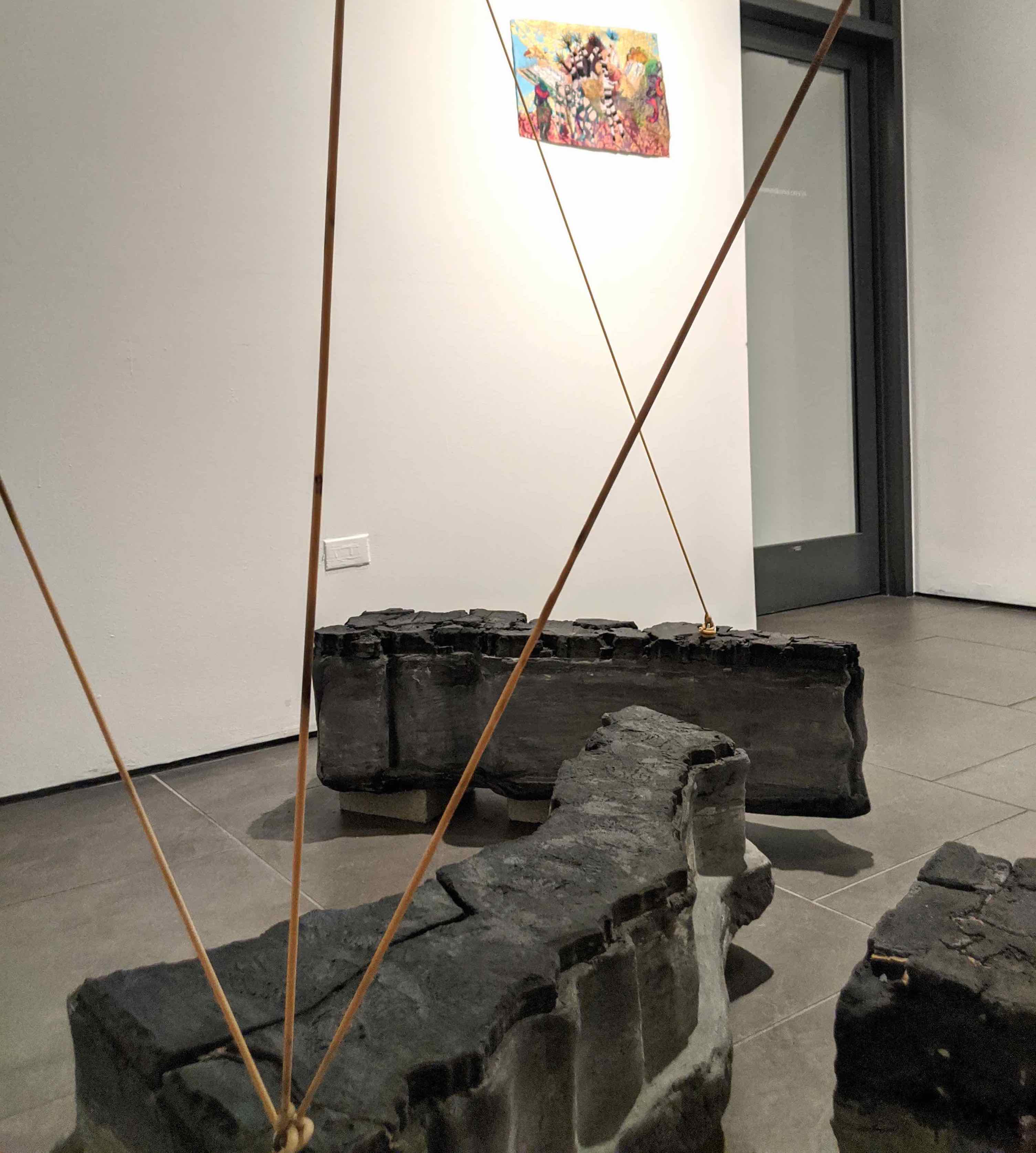 "The work presented in this exhibition echoes her story by underscoring the chaotic breakdown of class and race structures after colonialism, territorialism, and human mobility. My studio practice is based in Tijuana and San Diego, and I employ found objects to forge new and poetic meanings around ethnic and gender identities, the ongoing circulation of culture and goods, and the possibilities of cultural hybridity. The concrete maps in this exhibition connect Nayeli’s journey with elastic slings, suggesting the bouncing and volatile changes in our borders. The embroidered imagery parallels the novel by taking serious political, economic, and migratory subjects with humor, stimulating reflections on our current status quo, metaphoric associations, and constructing new procedural semantics." –Griselda Rosas