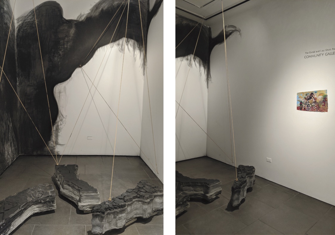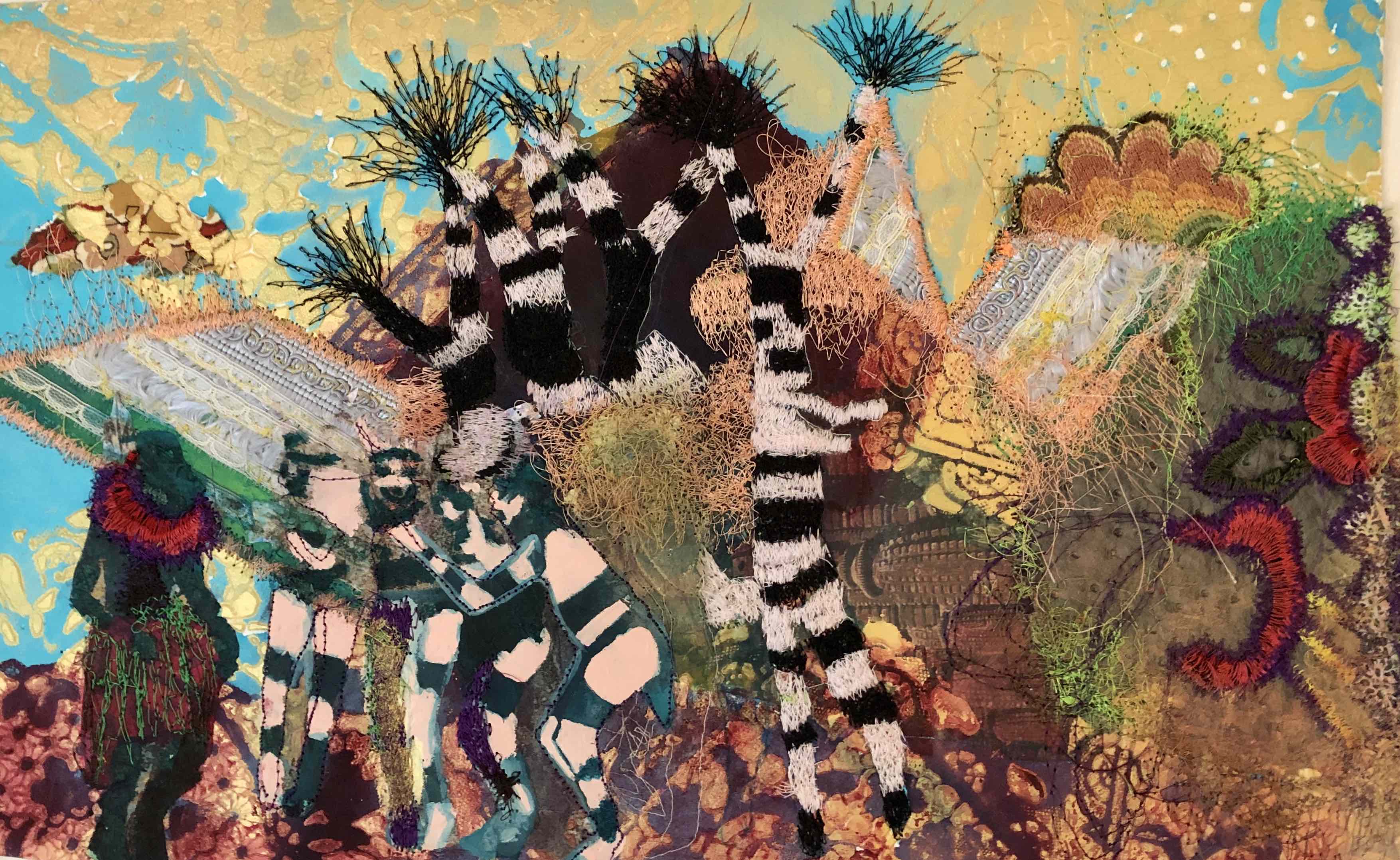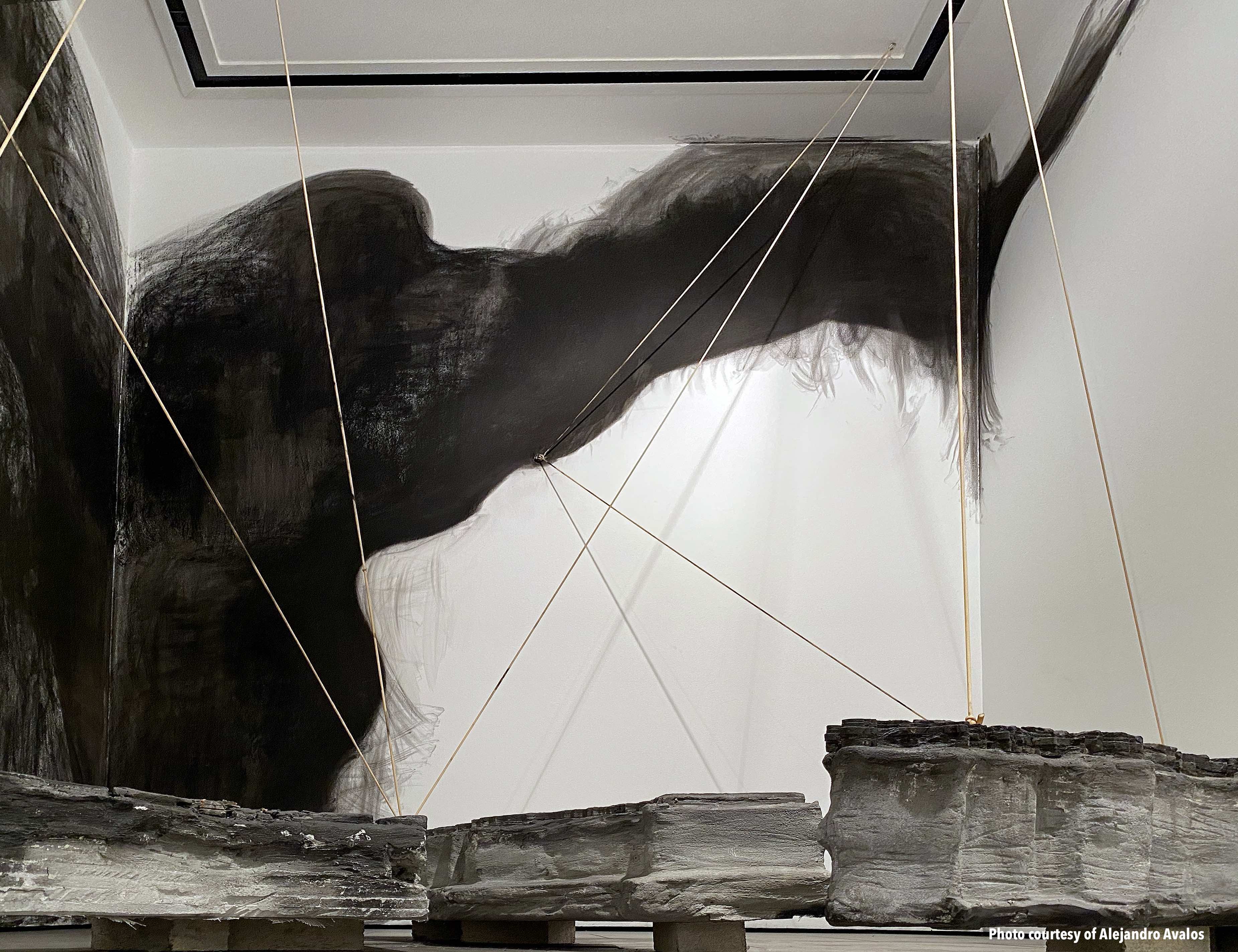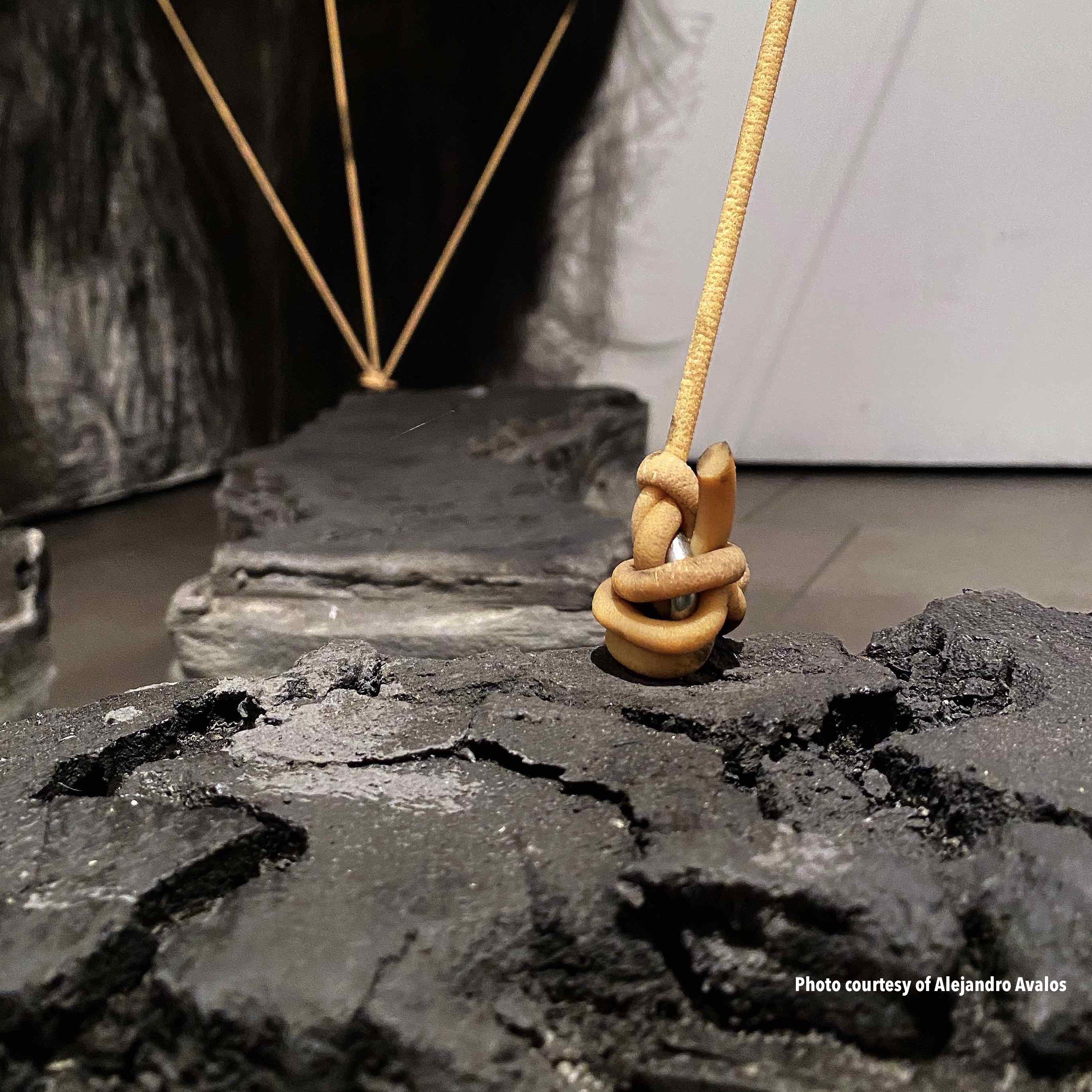 "The work presented in this exhibition echoes her story by underscoring the chaotic breakdown of class and race structures after colonialism, territorialism, and human mobility. My studio practice is based in Tijuana and San Diego, and I employ found objects to forge new and poetic meanings around ethnic and gender identities, the ongoing circulation of culture and goods, and the possibilities of cultural hybridity. The concrete maps in this exhibition connect Nayeli’s journey with elastic slings, suggesting the bouncing and volatile changes in our borders. The embroidered imagery parallels the novel by taking serious political, economic, and migratory subjects with humor, stimulating reflections on our current status quo, metaphoric associations, and constructing new procedural semantics." –Griselda Rosas