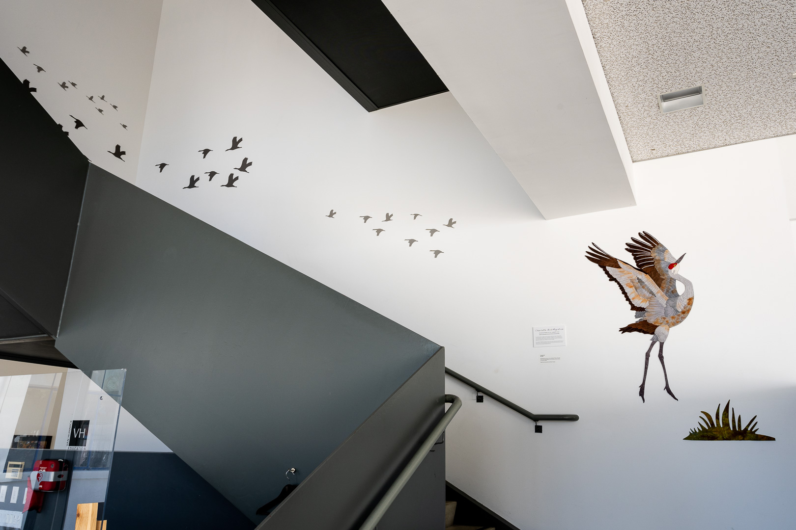 Artist Charlotte Bird is fascinated by the cycles of life in nature. She is troubled by observations that climate change is slowly and subtly changing the birds’ lives. The success of the sandhill crane rests on its ability to adapt to diverse habitats extending from the Arctic to the subtropics. The birds cannot adapt to nesting grounds flooded by melting permafrost or to flooded feeding-grounds in Nebraska and California.