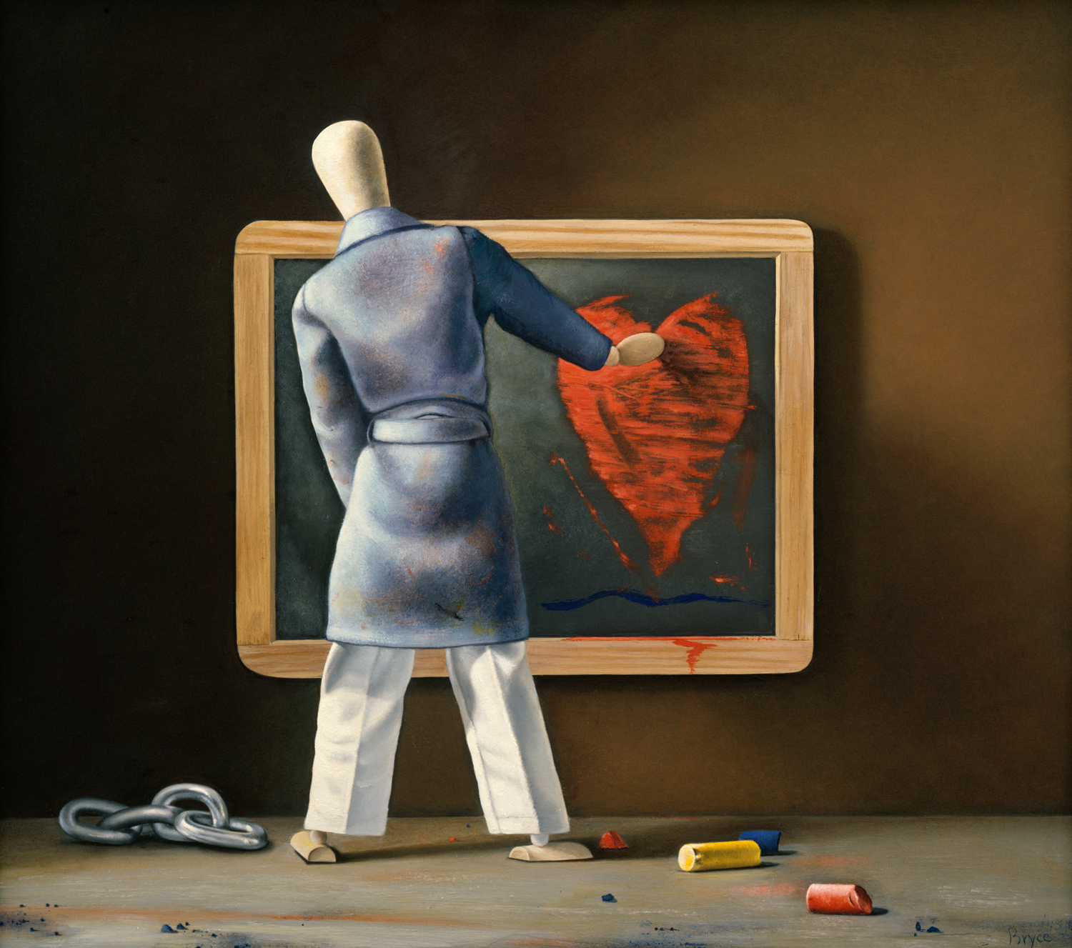 Bryce pursues an open exploration of painting and uses the fundamental elements—of paint and wood panel—to skillfully investigate contemporary ideas and ideologies. Deeply aware of the historical precedents of realist painting, he sometimes evokes images and memories, while at other times uses the elements of painting to its own end. Inherent throughout his work are issues of perception and understanding. With technical virtuosity, Bryce develops his narratives with cleverness and wit that engage the viewer in his distinctive artistic language. Fundamental to this exhibition is the commanding use of Bryce's exquisite pictorial technique, capable of portraying an object, as well as a classic work of art, in the most faithful way.