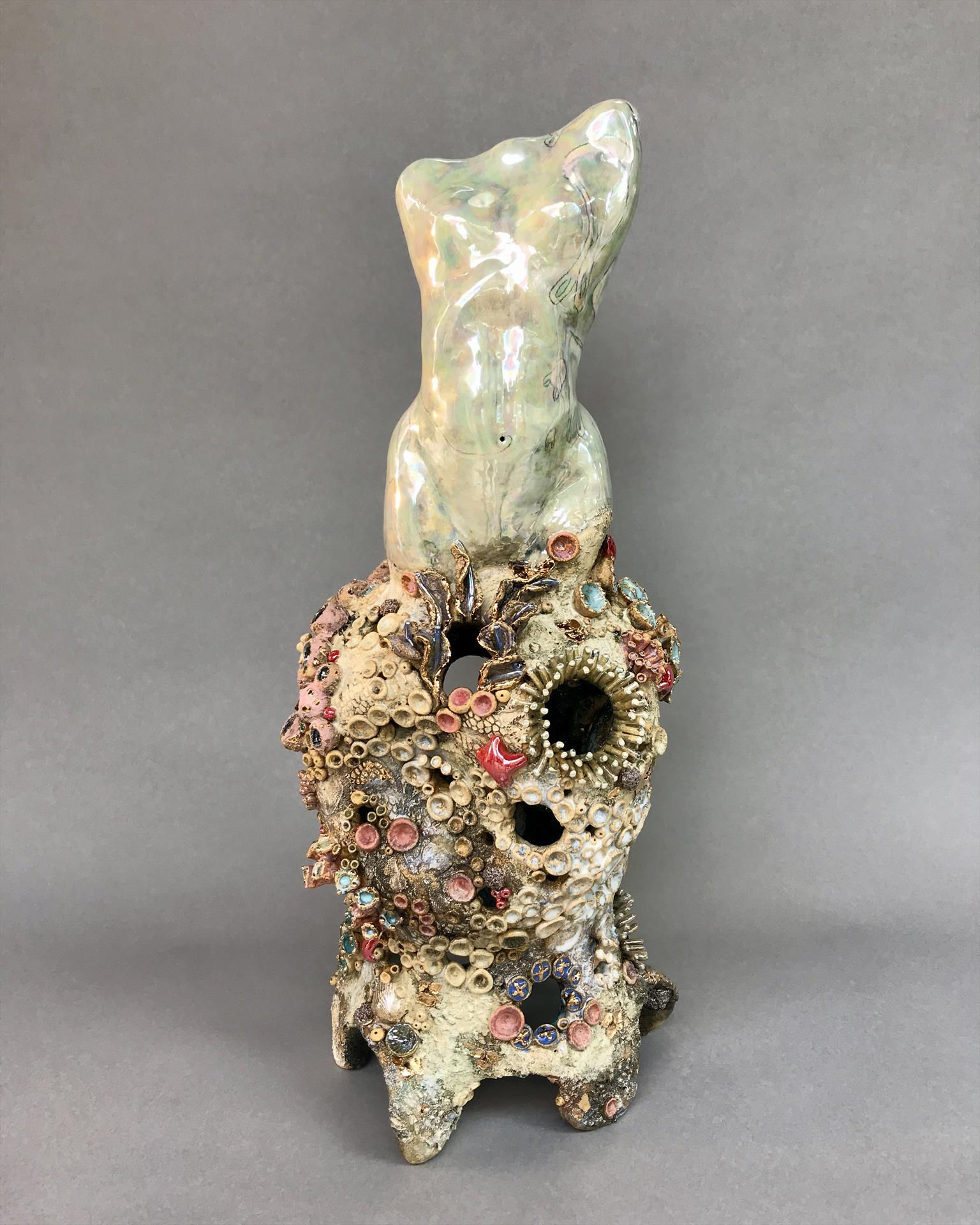 Stoneware clay, slip-cast and coil-built, and oxides, 22.2" x 9" x 9.5".