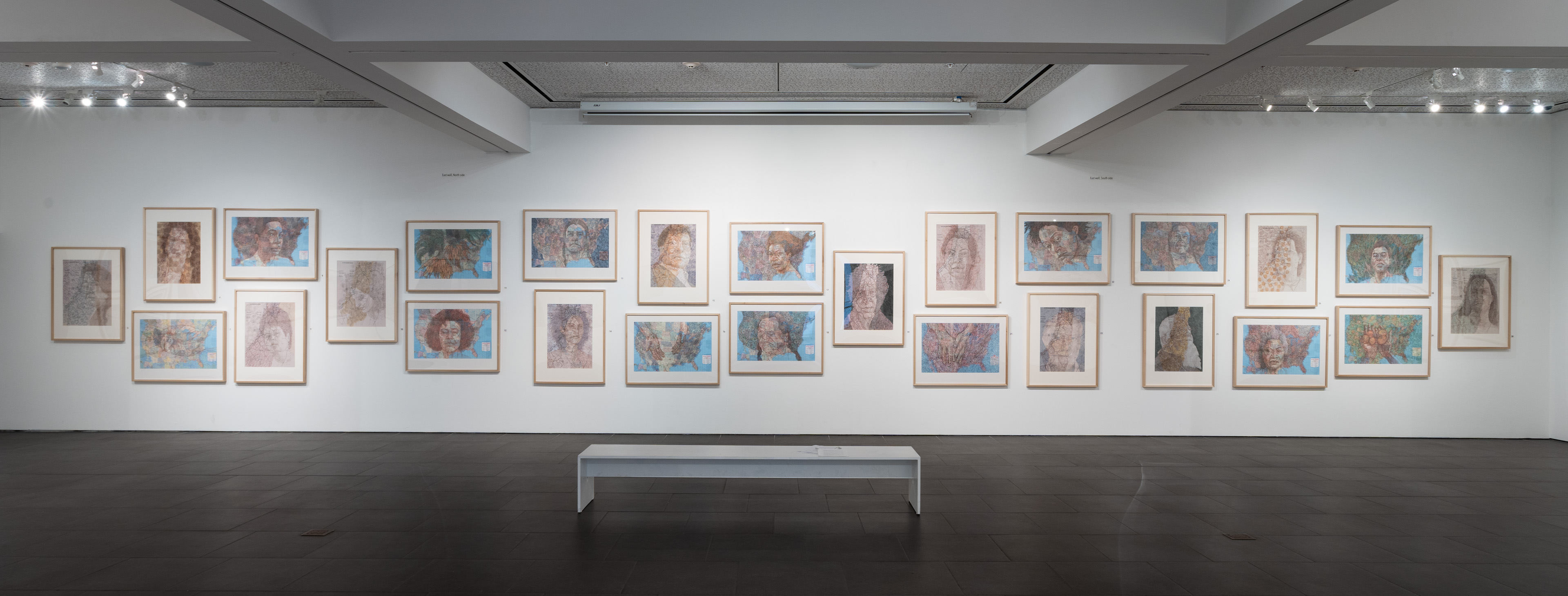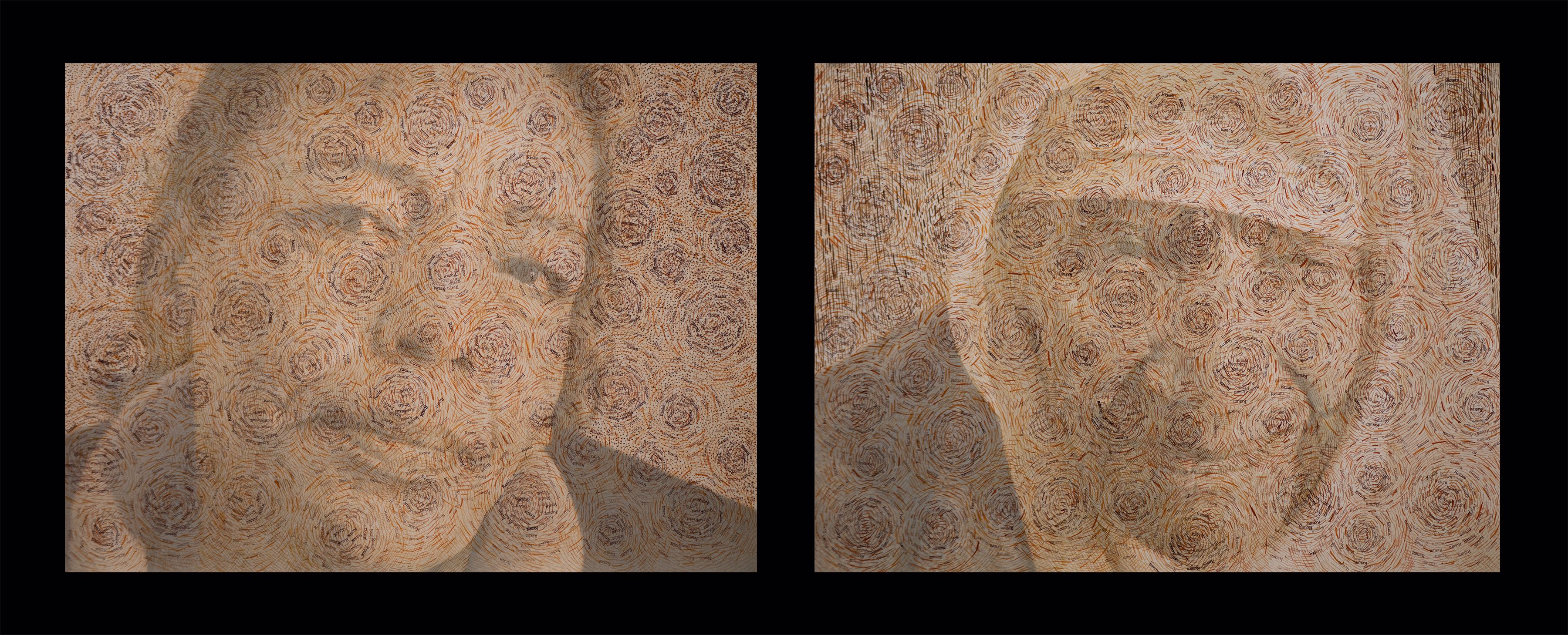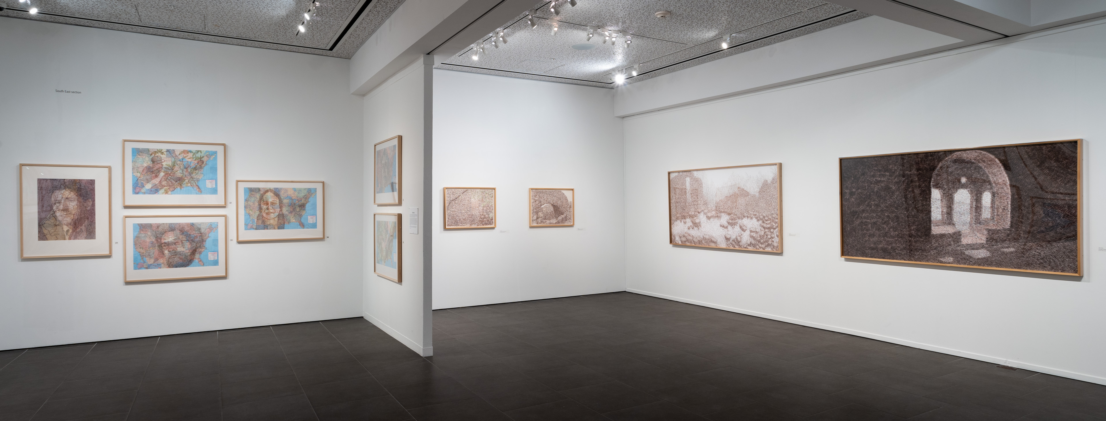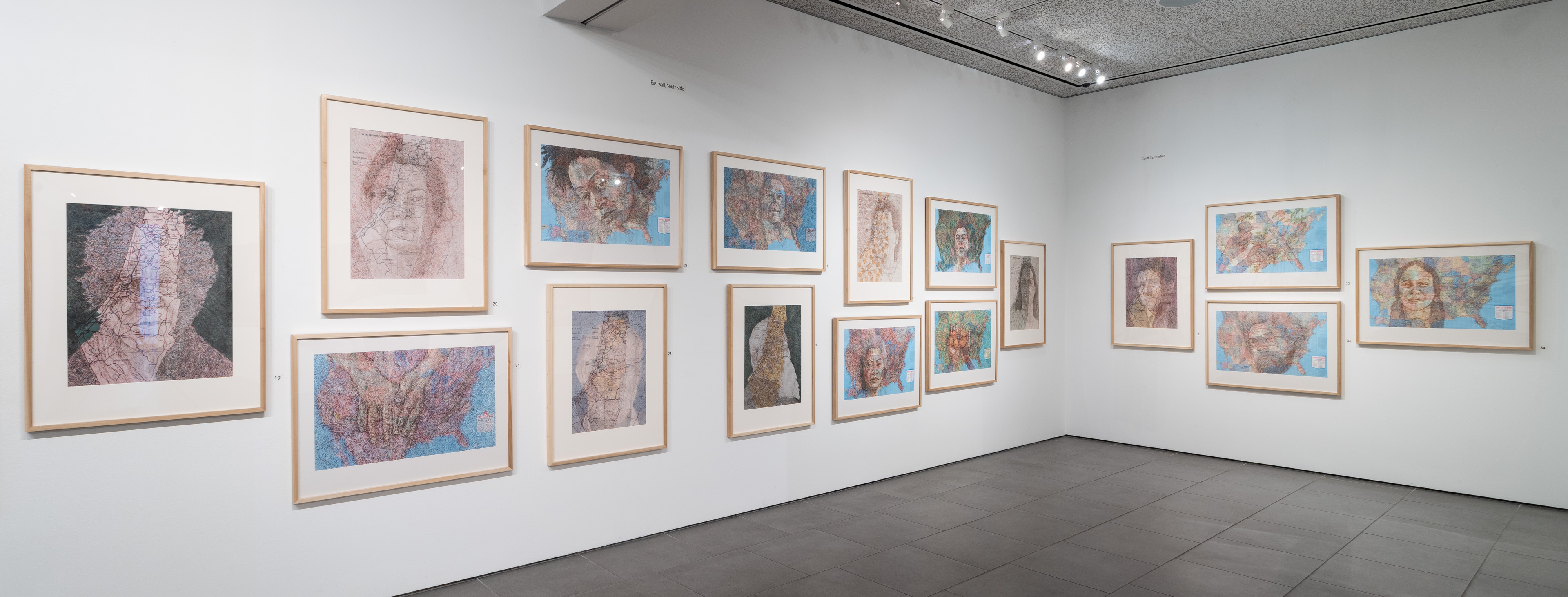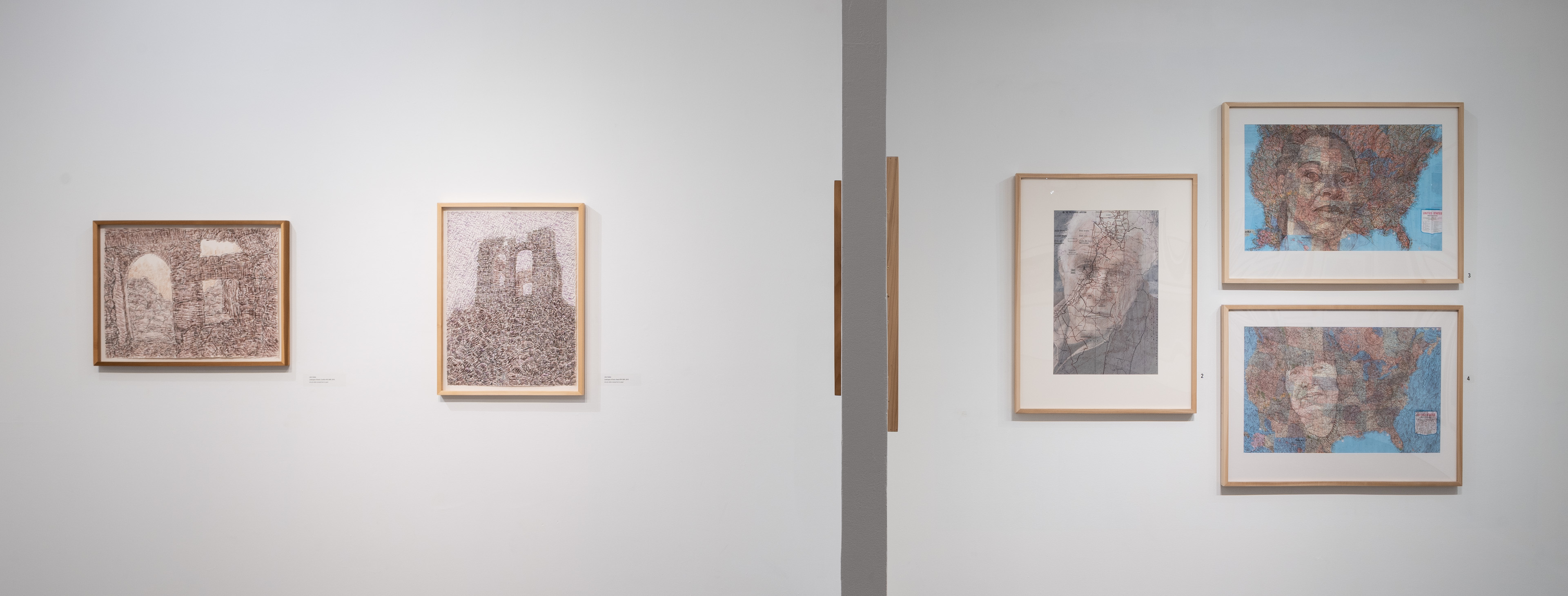 A variety of creative graphic strategies are utilized by the artist to construct his visual allegories. In the images selected for the exhibition, Halaka overlays drawings on top of photographs to underscore the emotional presence and physical absence of the subjects; he defines forms with layers of rubber-stamped words and ink to create imposing yet unstable figures and landscapes; he draws portraits of survivors on commercially produced maps to suggest the resurgence of erased cultures and suppressed histories; and he develops spectral portraits of refugees with burning tools on wood substrates. The images are dense due to their layered clusters of carefully arranged marks, yet are simultaneously delicate, fluid, and fugacious due to the subtlety of their tones and the fragmented and restless arrangement of the drawn marks.