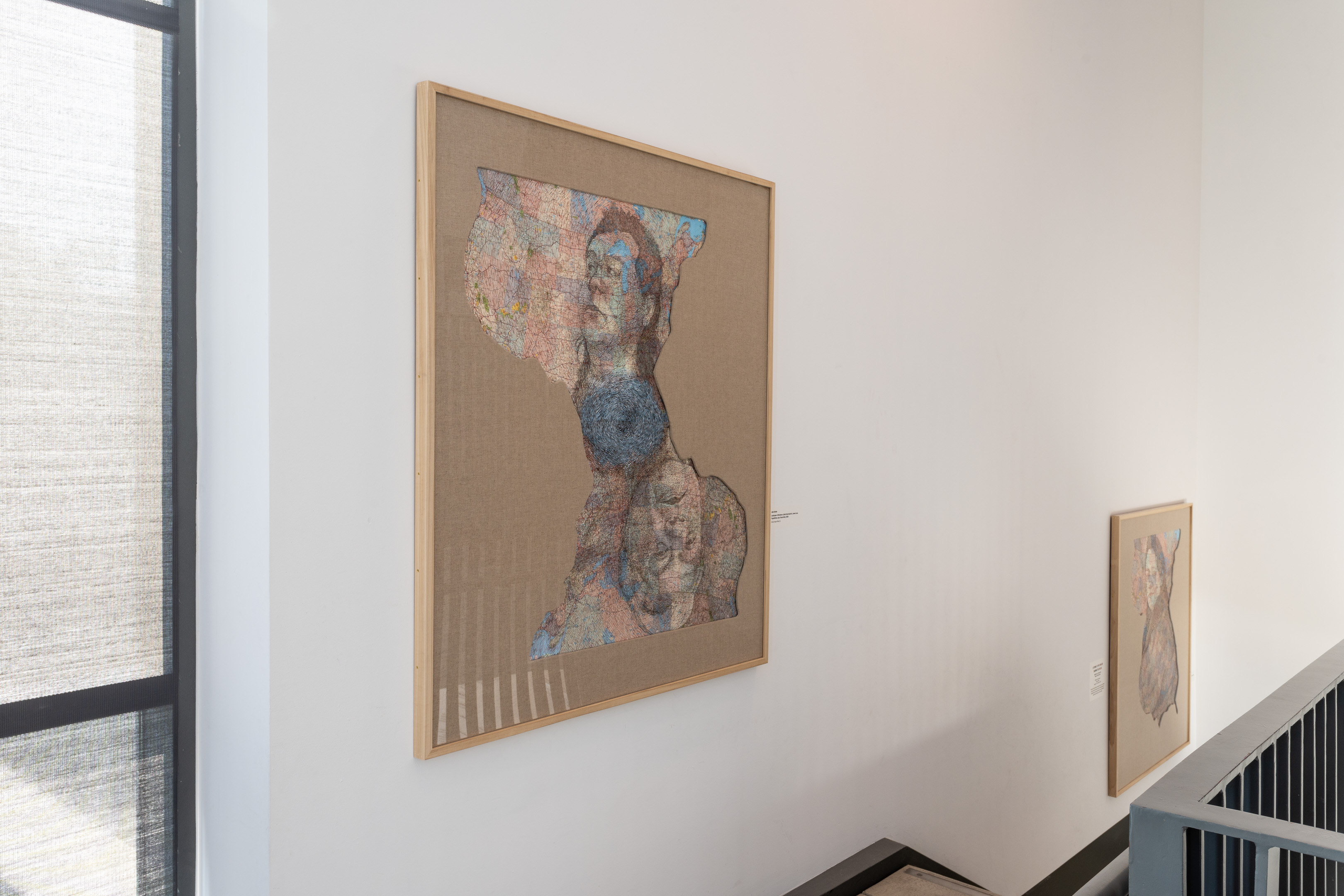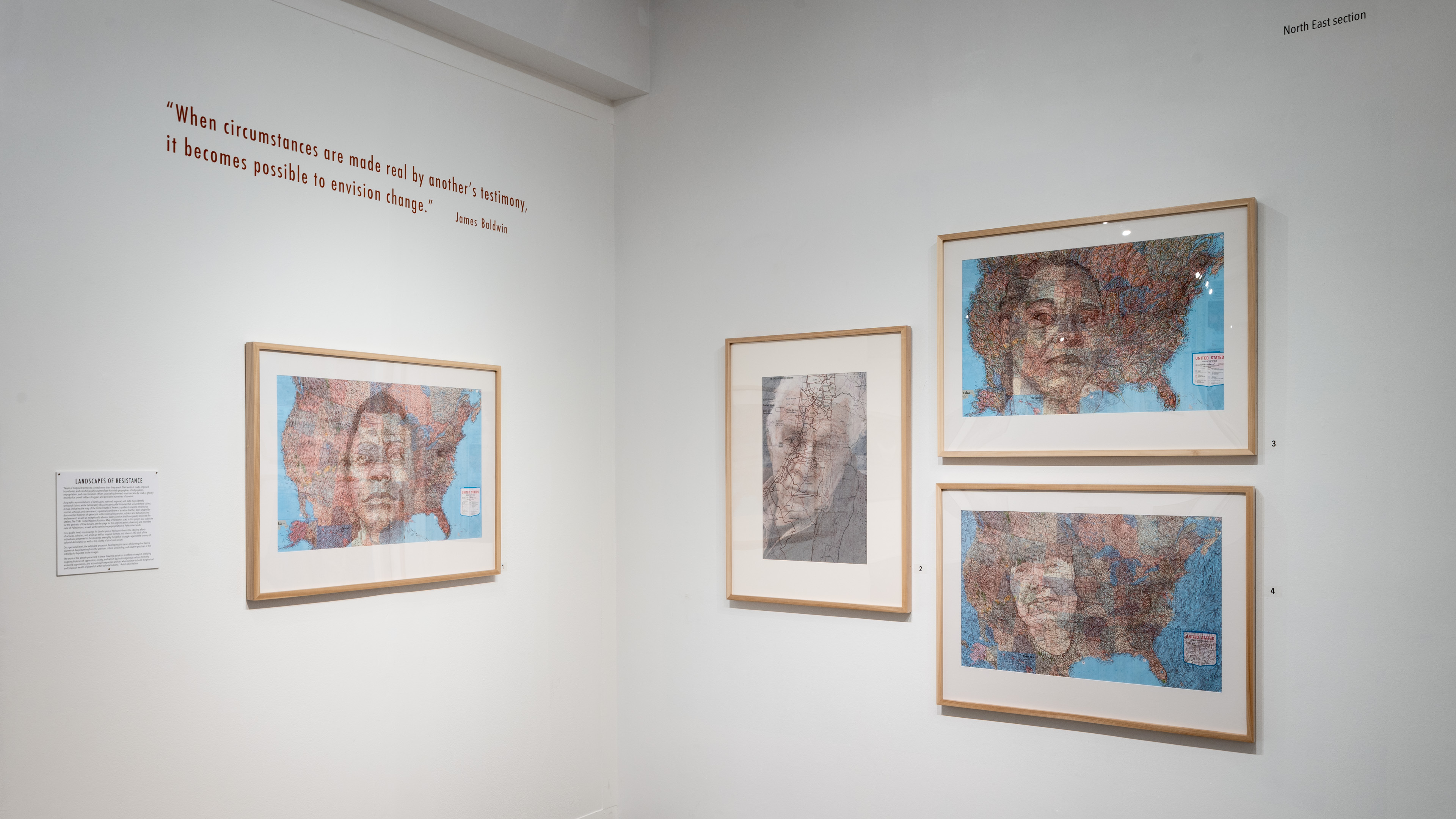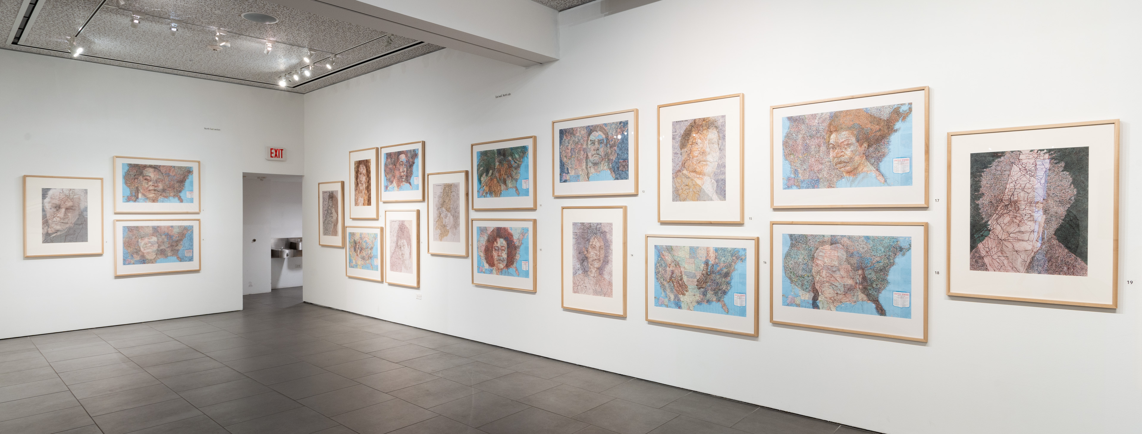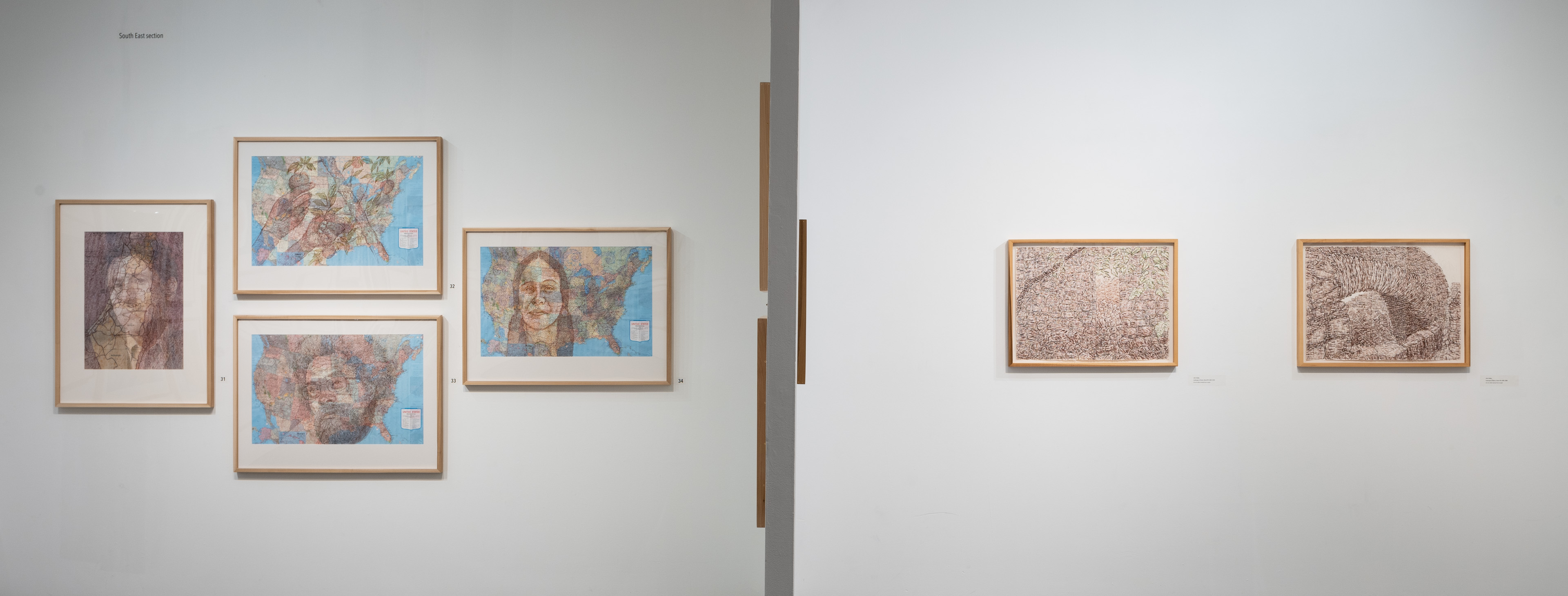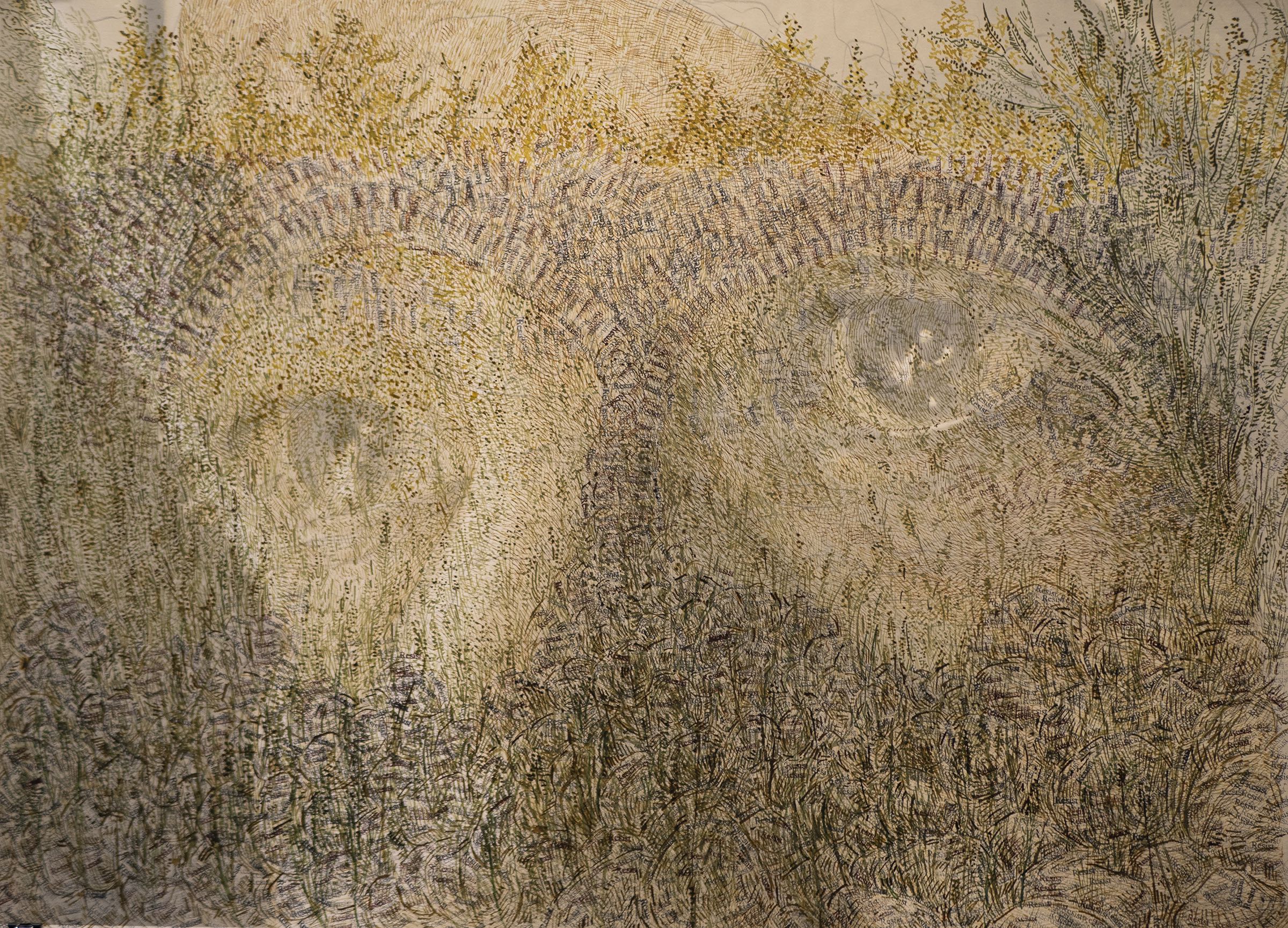 A variety of creative graphic strategies are utilized by the artist to construct his visual allegories. In the images selected for the exhibition, Halaka overlays drawings on top of photographs to underscore the emotional presence and physical absence of the subjects; he defines forms with layers of rubber-stamped words and ink to create imposing yet unstable figures and landscapes; he draws portraits of survivors on commercially produced maps to suggest the resurgence of erased cultures and suppressed histories; and he develops spectral portraits of refugees with burning tools on wood substrates. The images are dense due to their layered clusters of carefully arranged marks, yet are simultaneously delicate, fluid, and fugacious due to the subtlety of their tones and the fragmented and restless arrangement of the drawn marks.