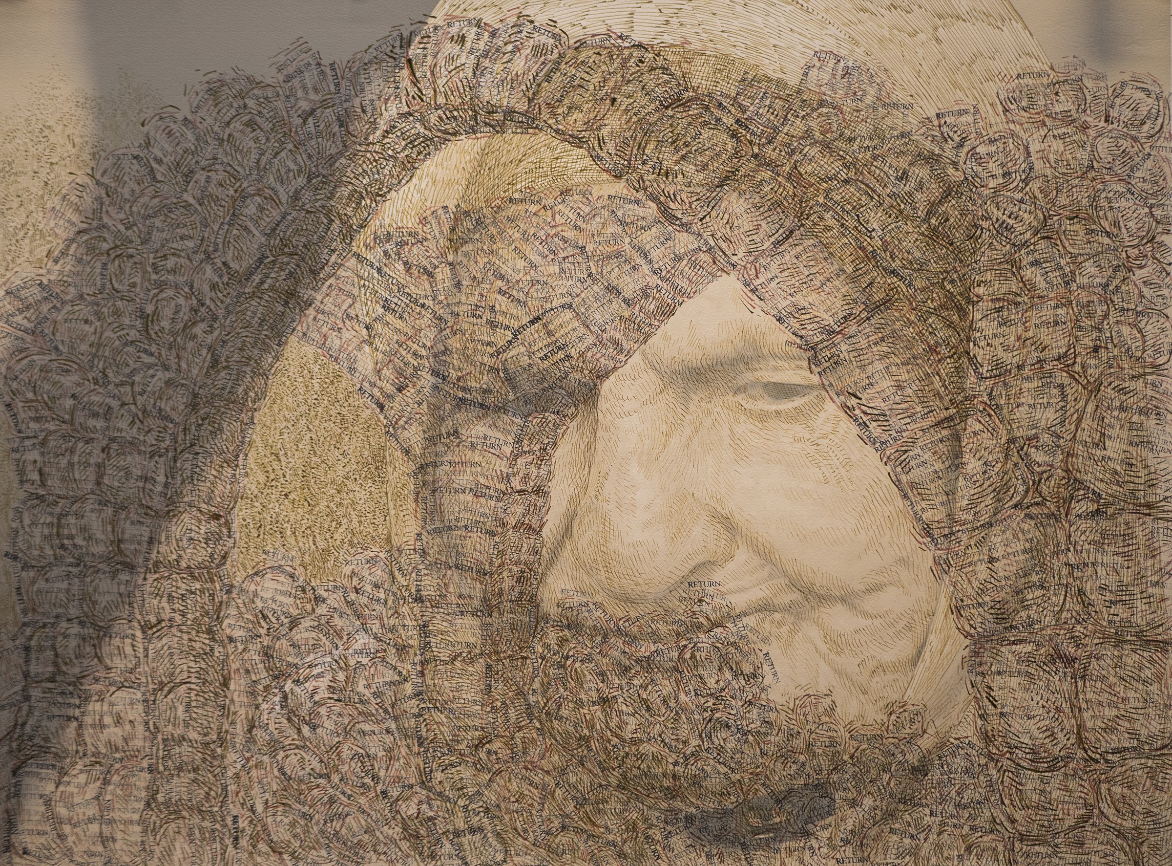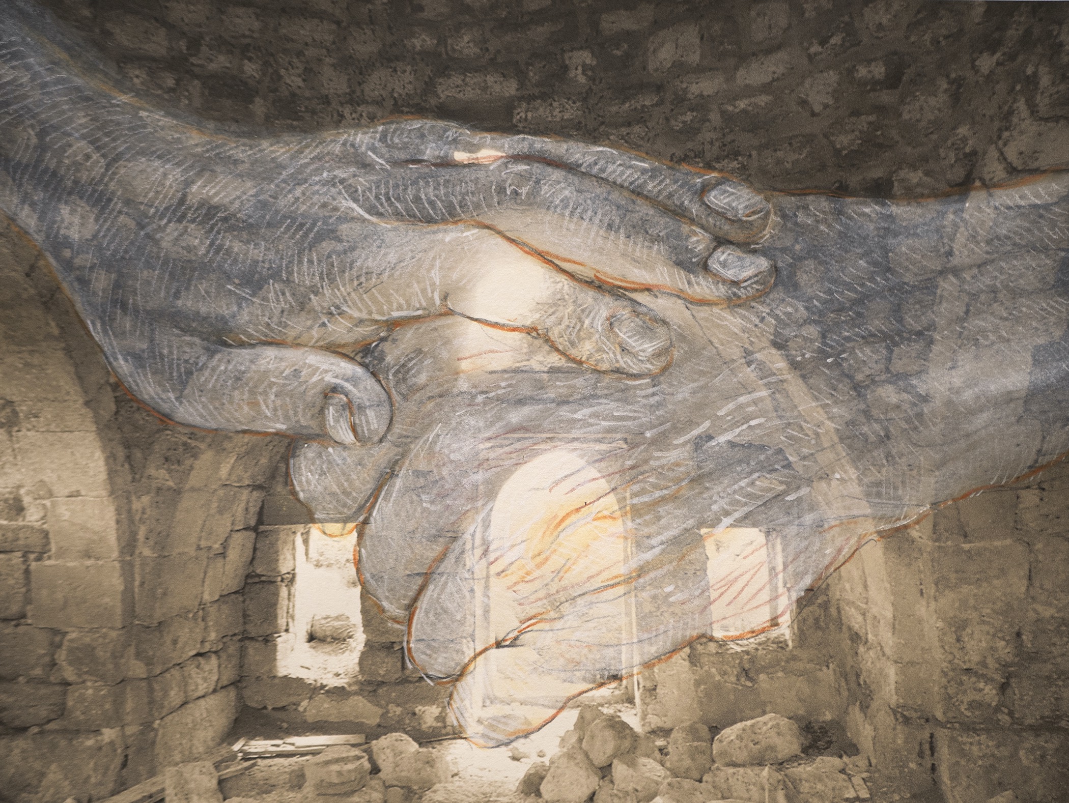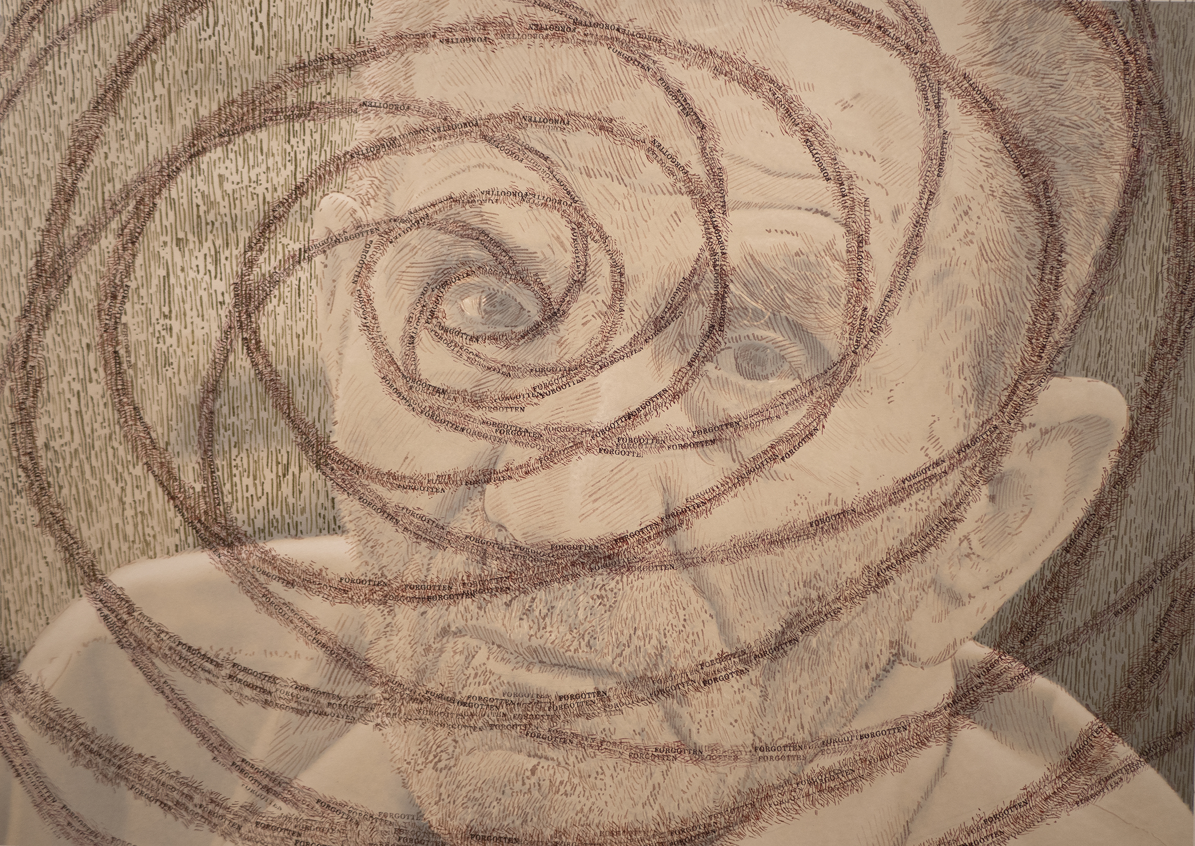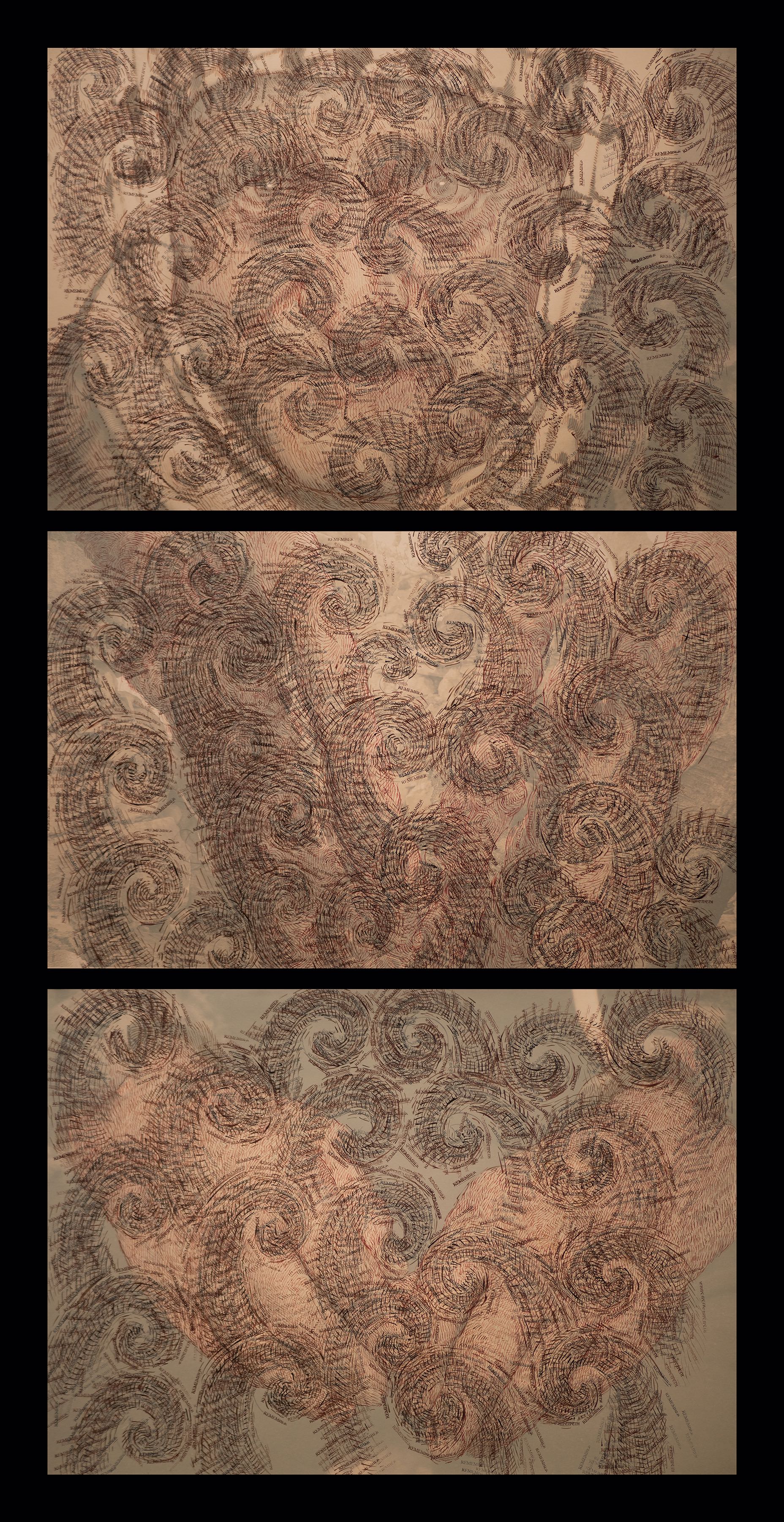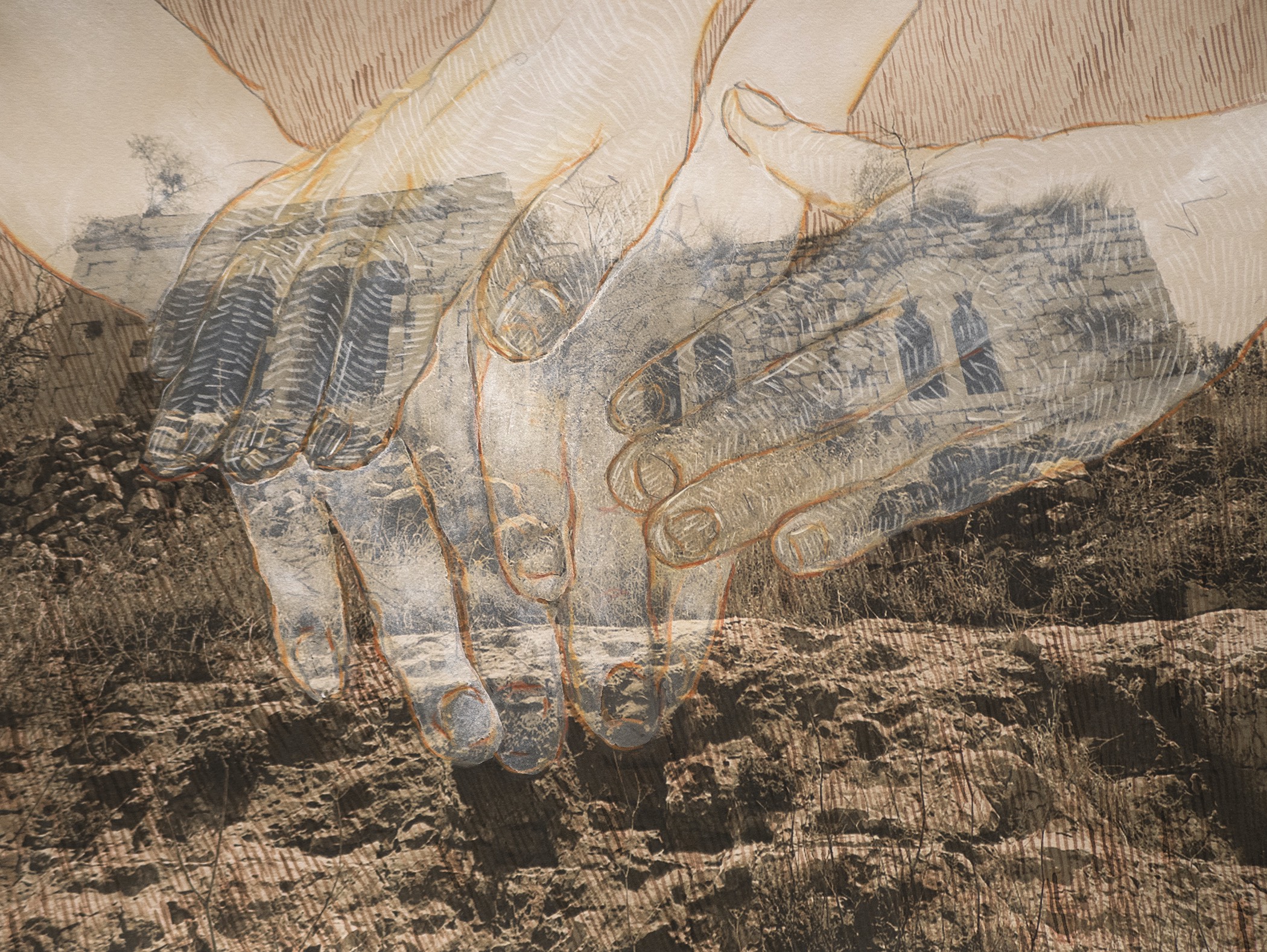A variety of creative graphic strategies are utilized by the artist to construct his visual allegories. In the images selected for the exhibition, Halaka overlays drawings on top of photographs to underscore the emotional presence and physical absence of the subjects; he defines forms with layers of rubber-stamped words and ink to create imposing yet unstable figures and landscapes; he draws portraits of survivors on commercially produced maps to suggest the resurgence of erased cultures and suppressed histories; and he develops spectral portraits of refugees with burning tools on wood substrates. The images are dense due to their layered clusters of carefully arranged marks, yet are simultaneously delicate, fluid, and fugacious due to the subtlety of their tones and the fragmented and restless arrangement of the drawn marks.