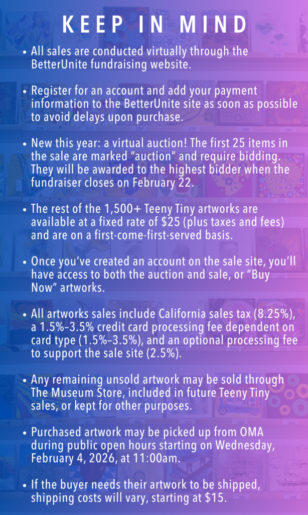 - Wednesday, January 28 - Sunday, February 1, 2026: Artwork will be on display for preview at OMA the week before the online sale opens