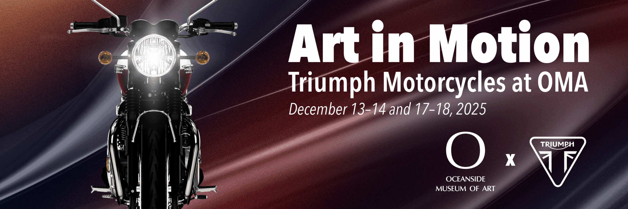 In partnership with Triumph Motorcycles, Oceanside Museum of Art is proud to announce this four day pop-up exhibition. Join us on December 13, 14, 17, and 18 for an experience unlike any you've encountered at OMA.